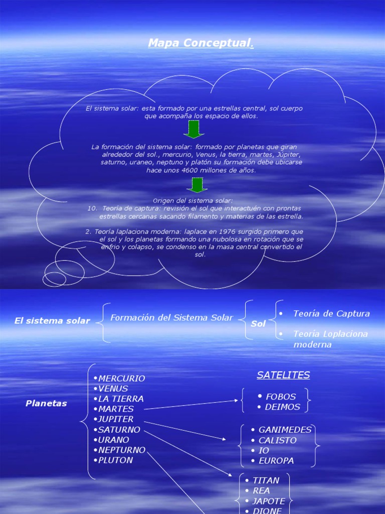Este Cmap, tiene información relacionada con MAPA CONCEPTUAL, LOS PLANETAS Jupiter, LOS PLANETAS ????. Nuestro sistema solar contiene una gran variedad de cuerpos celestiales – el mismo Sol, nuestros ocho planetas, los planetas enanos y los asteroides y en nuestra Tierra, ¡ vida!El sistema solar interior es visitado ocasionalmente por cometas que regresan de lo más lejano del sistema solar en órbitas altamente elípticasEn las regiones más lejanas del sistema solar encontramos el. The picture that you see on any given date represents what the real Solar System looked like on that date Solar System This scenario shows all the planets of the Solar System Also included is Halley's comet, but its orbit is an approximation, as it is perturbed by the planet's masses Inner Solar System.