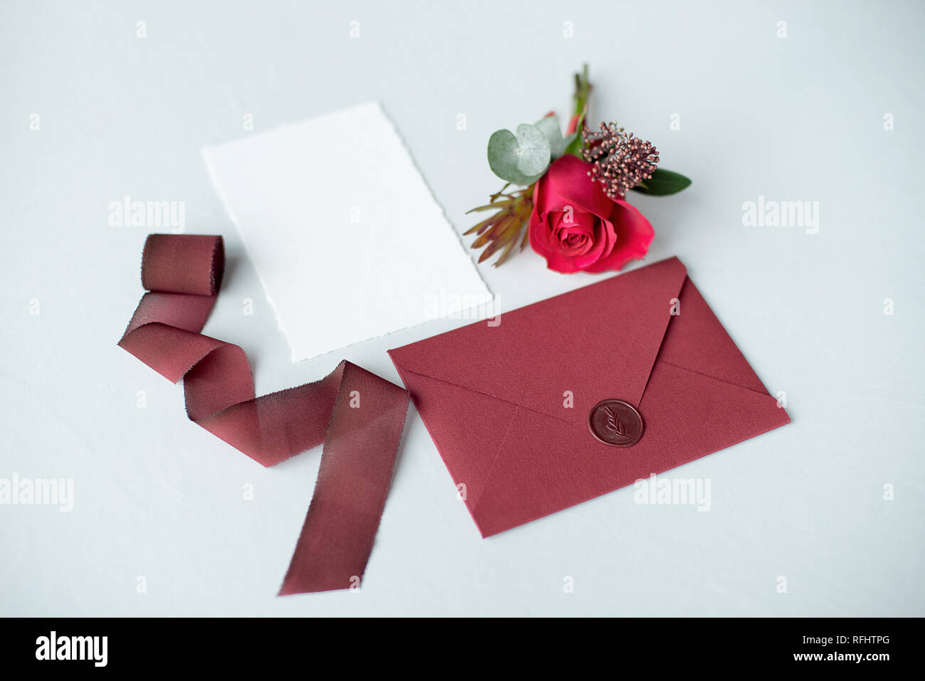 Invitacion De Boda Como Un Decorado Carta Sobre Un Mantel Blanco Con Un Arreglo Floral Fotografia De Stock Alamy