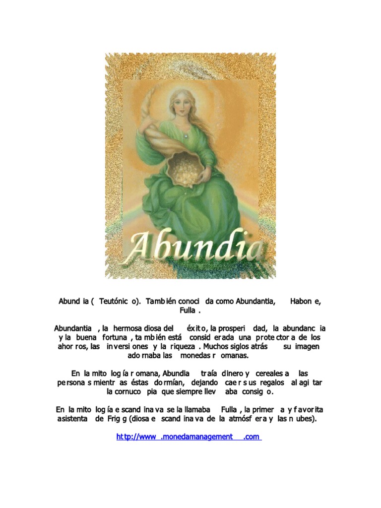 La Señora Abundancia o Señora Fortuna, es un Ser de Luz del Sexto 6º Rayo Oro Rubí de la Provisión Divina que rige el Arcángel URIEL Conocida como “Abundia”, diosa romana llamada “Abundantia” (Abundancia), en italiano “Abbondanza”. 10dic Explora el tablero de Cesareo Cruz "Diosa de la fortuna" en Ver más ideas sobre diosa de la fortuna, fortuna, angel de la abundancia. Es la misma personificación de la diosa Venus, pero también es tremendamente generosa Eso si, ten en cuenta que es extremadamente celosa de sus posesiones, por lo que cuando le hagas una ofrenda, como puede ser una calabaza, no te olvides que que pasa a ser de su posesión y mientra dure tu petición, debes abstenerte comer de ella.
