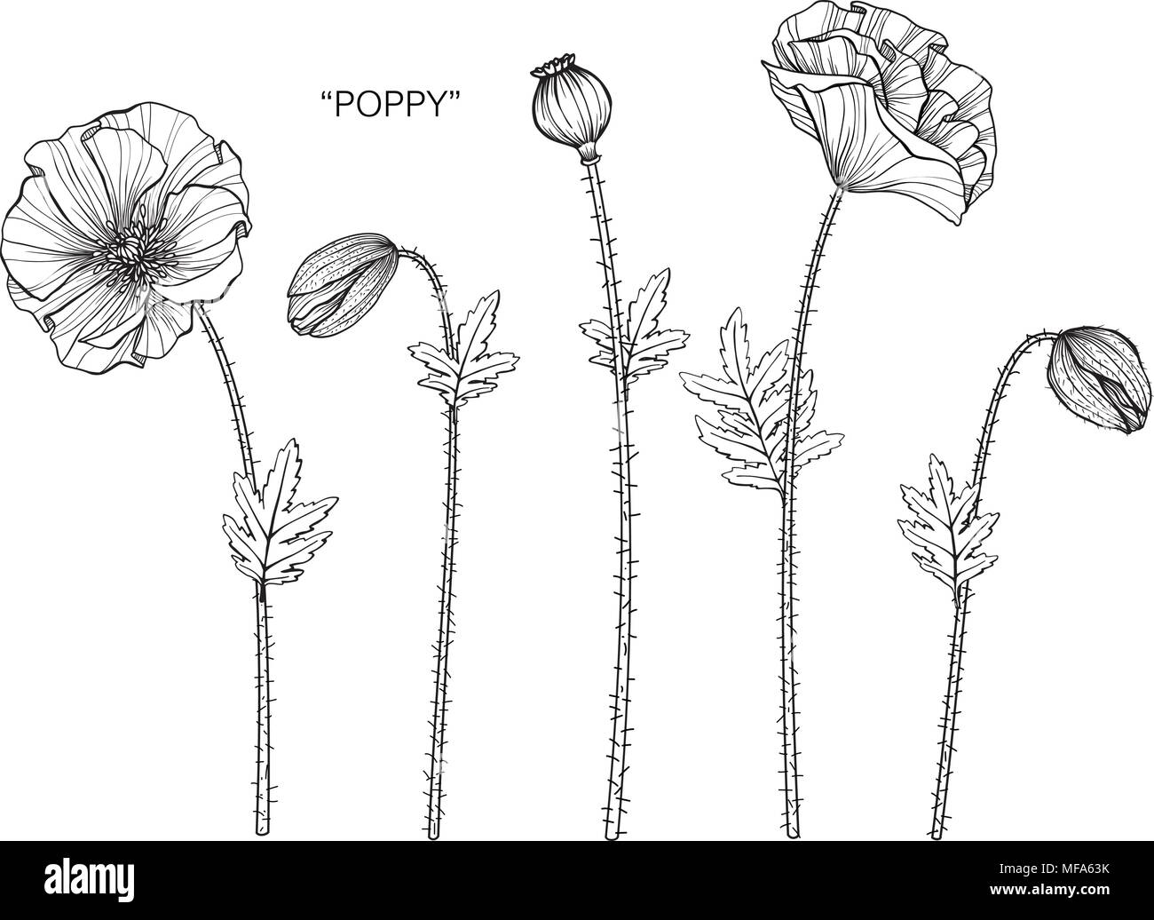Ilustracion Dibujo De Flores De Amapola Blanco Y Negro Con Lineas Sobre Fondos Blancos Imagen Vector De Stock Alamy