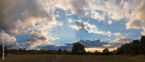 Hermoso Paisaje Con Cielo De Atardecer Lleno De Nubes Misticas Con Rayos De Del Sol Que Brotan Tras Los Arboles Y El Cielo Lleno De Nubes Buy This Stock Photo And