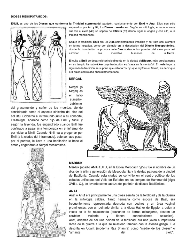 Es en los poemas sumerios y en el célebre Código de Hammurabi donde aparece la figura de Enlil, un dios perverso y manipulador Enlil era hijo de Anu (el dios del cielo) y de Ki (la diosa de la tierra) A pesar de que su hermano Enki era el hijo primogénito, él se convirtió en el heredero al trono del pueblo sumerio. Entra a http//wwwsecretosmundialesinfo tenemos mucha mas informacion relacionada con las verdades ocultas de este mundo Creditos del video a http//. Mitos Hijo del dios del cielo An y de la diosa Ki, al nacer, separó el cielo "An" de la tierra "Ki"Enlil, An (Anu en acadio) y Enki forman la trinidad suprema del panteón sumerio Enlil era la divinidad patrona de Nippur y guardaba "las tablillas del destino" donde se encuentra decretado el destino de todo lo existente En el mito de Enlil y Ninlil se narra cómo el dios se encuentra a.