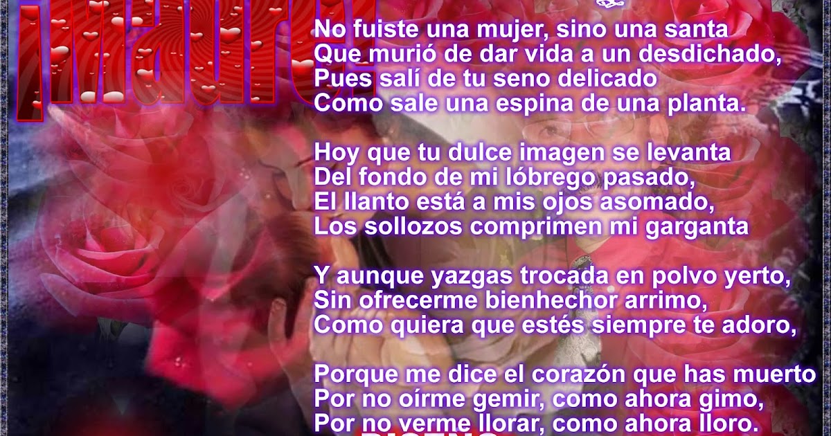 Publicado por Karen Ramírez en 924 1 comentario Unknown 26 de agosto de 19, 1009 Para madres es el poema 😊😭. Y me acompañas y me asistes y me infundes serenidad Cuando el áspid del hastío me roe, tengo unos libros que son en las horas cruentas mirra, aloe, de mi alma. Manos las de mi madre, tan acariciadoras, tan de seda, tan de ella, blancas y bienhechoras ¡Sólo ellas son las santas, sólo ellas son las que aman, las que todo prodigan y nada me reclaman!.