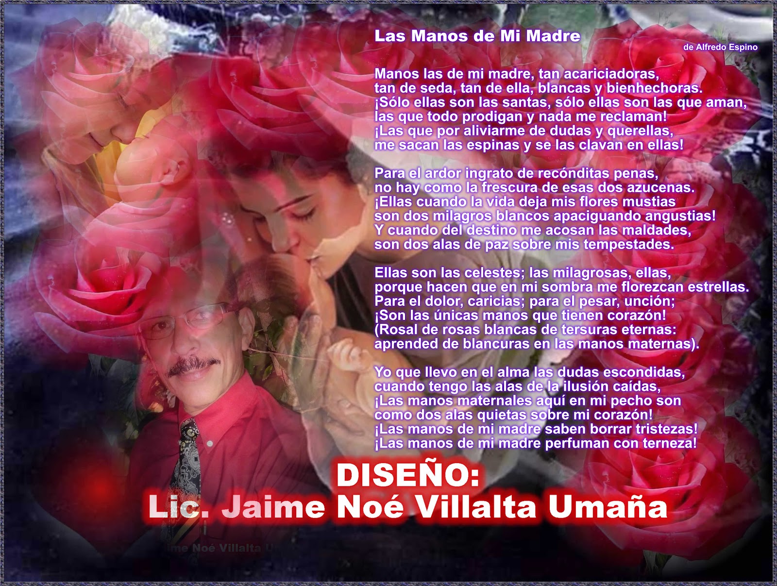 Poema Las manos de mi Madre, Alfredo Espino Ahuachapán Manos las de mi madre, tan acariciadoras, tan de seda, tan de ella, blancas y bienhechoras. Leer la poesía Las manos de mi madre del poeta Alfredo Espino en el sitio Blogpoemas los mejores poemas hermosos sobre el amor, la naturaleza, la vida, la Patria, para niños y adultos en español de los célebres poetas clásicos. Colaboración Álvaro Castaño Castillo, fundador y director de la emisora HJCK Este poema forma parte del acervo de la audiovideoteca de Palabra Virtual Las manos de mi madre Manos que en el crespón de la tiniebla de la noche insonora pálidas flotan como airón de niebla!.