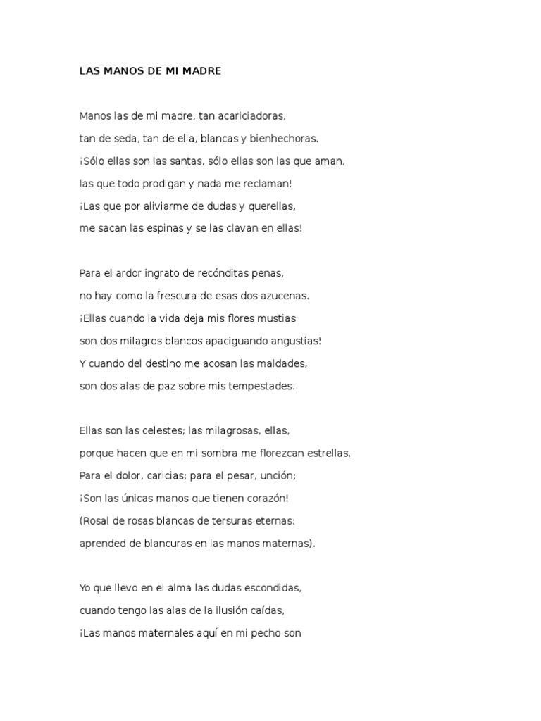 LAS MANOS DE MI MADRE Manos las de mi madre, tan acariciadoras, tan de seda, tan de ella, blancas y bienhechoras ¡Sólo ellas son las santas, sólo ellas son las que aman, las que todo prodigan y nada me reclaman!. Este día presento mi segunda temporada de cuentos infantiles, poesía y consejos para niños, espero les guste todo el nuevo contenido de valor y de entretenimiento familiarEl Poema Las Manos de Mi Madre, fue. Manos las de mi madre, tan acariciadoras, tan de seda, tan de ella, blancas y bienhechoras ¡Sólo ellas son las santas, sólo ellas son las que aman, las que todo prodigan y nada me reclaman!.