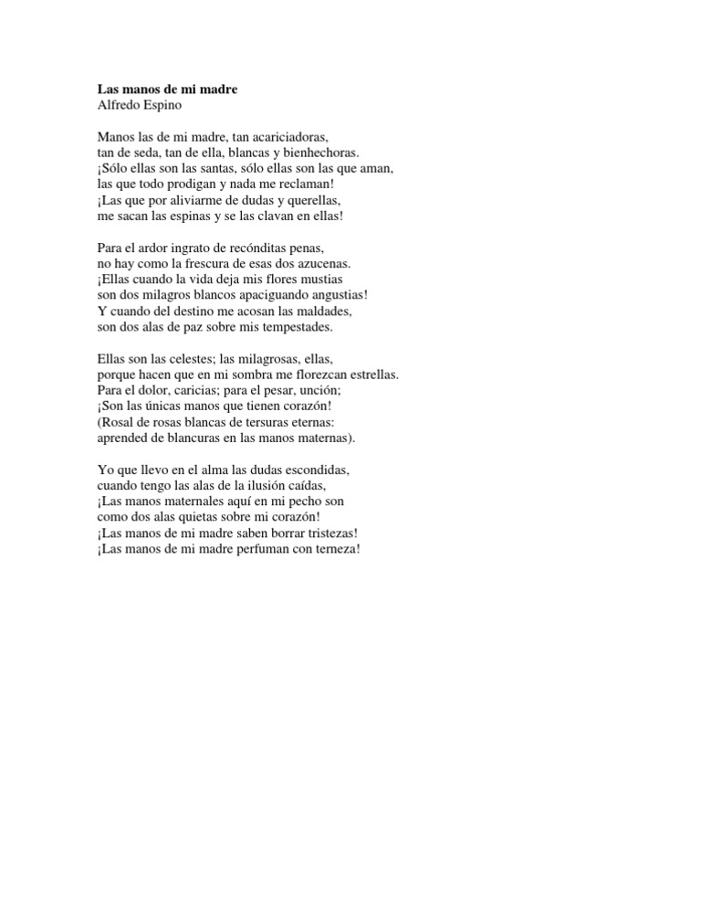 Las manos de mi madre (Alfredo Espino) Manos las de mi madre, tan acariciadoras, tan de seda, tan de ella, blancas y bienhechoras Para el ardor ingrato de recónditas penas, no hay como la frescura de esas dos azucenas ¡Ellas cuando al vida deja mis flores mustias son dos milagros blancos apaciguando angustias!. About Press Copyright Contact us Creators Advertise Developers Terms Privacy Policy & Safety How YouTube works Test new features Press Copyright Contact us Creators. ¡Las manos de mi madre perfuman con ternezas!.