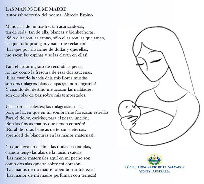 Tengo tus tristes manos suaves que se posan como dos aves sobre la cruz de mi aflicción Para aliviar las horas tristes de mi callada soledad me basta ¡saber que tú existes!. Poema Las manos de mi Madre, Alfredo Espino Ahuachapán Manos las de mi madre, tan acariciadoras, tan de seda, tan de ella, blancas y bienhechoras. Si las beso, la púrpura de brasa de mi boca empalidece de su blancor de piedra de agua ¡Tus manos entre sueños!.