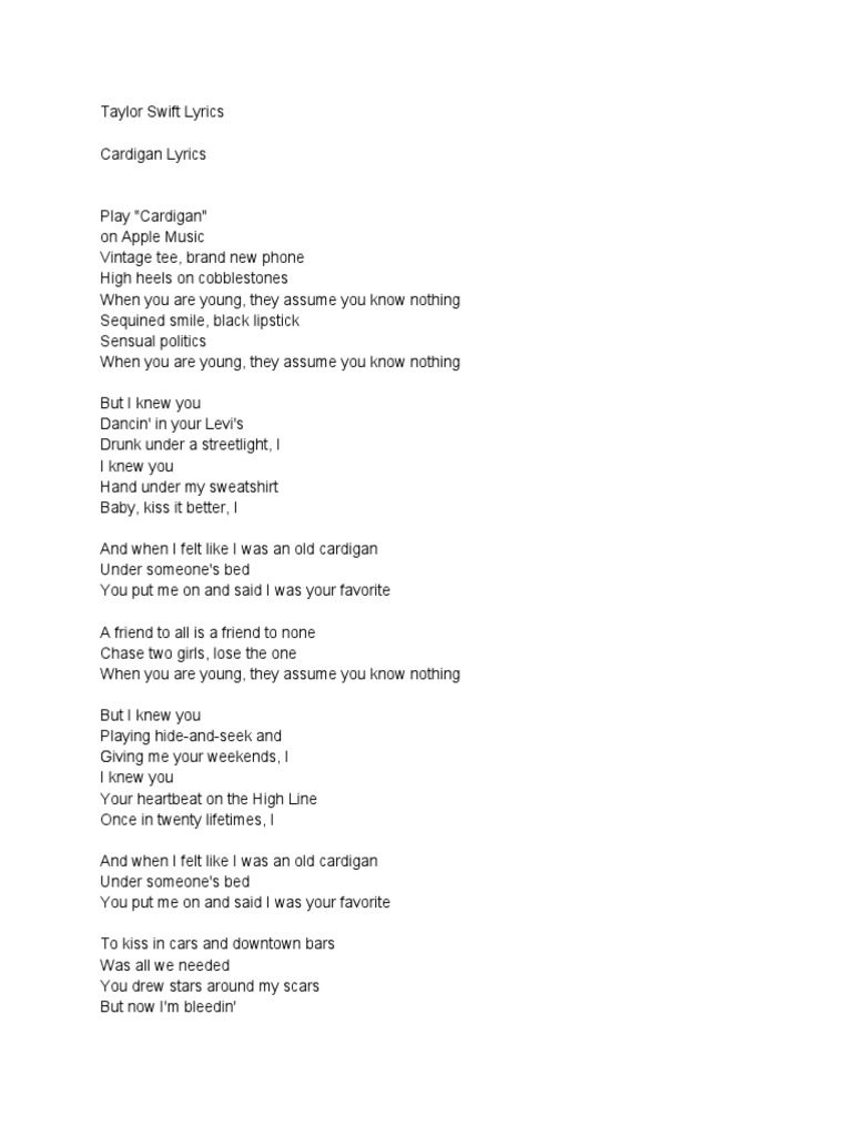 TAYLOR SWIFT Cardigan Lyrics Verse 1 Vintage tee, brand new phone High heels on cobblestones When you are young, they assume you know nothing Sequin smile, black lipstick Sensual politics When you are young, they assume you know nothing. Taylor Swift – Cardigan Lyrics Verse 1 Vintage tee, brand new phone High heels on cobblestones When you are young, they assume you know nothing Sequined smile, black lipstick Sensual politics When you are young, they assume you know nothing Chorus But I knew you Dancin' in your Levi's. And when I felt like I was an old cardigan Under someone's bed You put me on and said I was your favorite Bridge To kiss in cars and downtown bars Was all we needed You drew stars around my scars But now I'm bleedin' Chorus 'Cause I knew you Steppin' on the last train Marked me like a bloodstain, I I knew you Tried to change the ending Peter losing Wendy, I.
