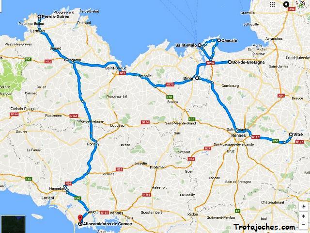 ️ Mapa de Bretaña Francia es un país ideal para realizar rutas en cocheAlgunas de ellas, como la Ruta de los Castillos, Ruta por los campos de lavanda de la Provenza o la Ruta por el MidiPyrénés, las trataré en otra ocasiónVamos a centrarnos en un road trip que recorre Bretaña, en el noroeste de Francia y limitando al norte con la región de Normandía, a la que hicimos una breve. Porque Bretaña es también su historia y sus leyendas, con enclaves tan importantes como Carnac, con sus impresionantes alineamientos megalíticos, la ciudad de Rennes, capital de la región, o el famoso bosque de Brocéliande, donde se cuenta que vivió el famoso Merlín. La historia de Bretaña comienza con un poblamiento cuyas trazas se remontan a la prehistoria, desde hace 700 000 años 1 El período neolítico, que comienza en estas regiones alrededor de 5000 a C, está marcado por el desarrollo de un importante megalitismo que se manifiesta en sitios como el cairn de Barnenez, el cairn de Gavrinis, la mesa de los mercaderes de Locmariaquer o los.