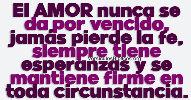 4 El amor es paciente y bondadoso El amor no es celoso ni fanfarrón ni orgulloso 5 ni ofensivo No exige que las cosas se hagan a su manera No se irrita ni lleva un registro de las ofensas recibidas 6 No se alegra de la injusticia sino que se alegra cuando la verdad triunfa 7 El amor nunca se da por vencido, jamás pierde la fe, siempre tiene esperanzas y se mantiene firme en toda. Si hay lenguas, cesarán;. 1 Corintios 13 Biblia Reina Valera 1960 La preeminencia del amor 1 Si yo hablase lenguas humanas y angélicas, y no tengo amor, vengo a ser como metal que resuena, o címbalo que retiñe.