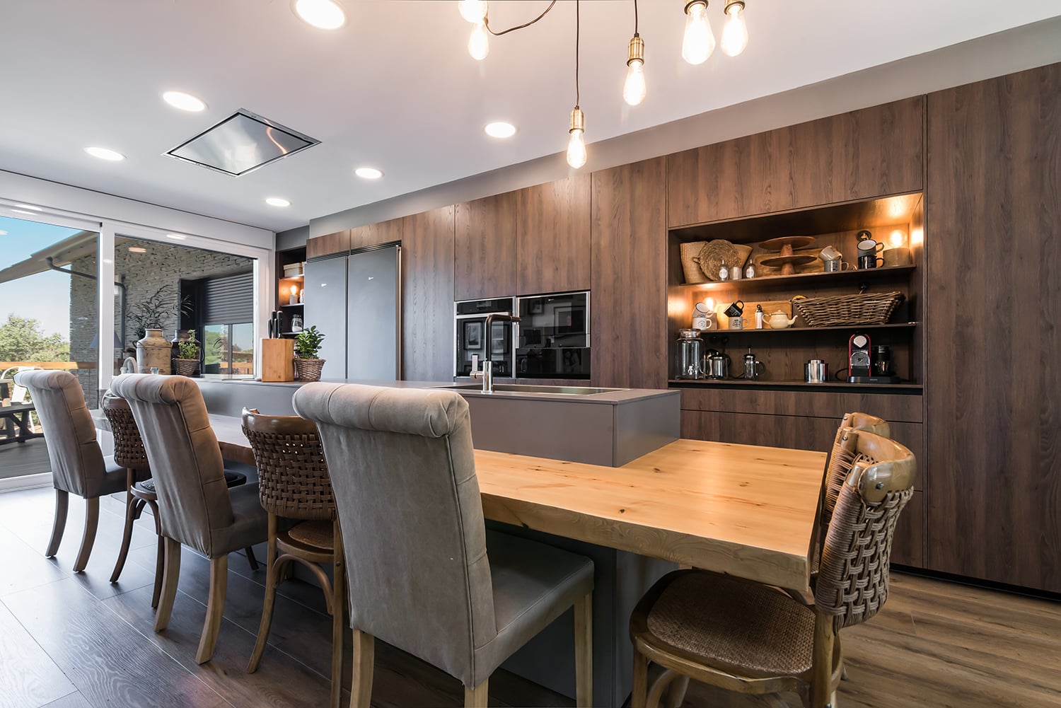 Tener una cocina unida al comedor y con una isla central, es tener lo último en decoración del hogar Han venido para quedarse y, haznos caso, es un elemento muy a tener en cuenta para que tengas la cocina de tus sueños Además, son fantásticas como complemento decorativo y se adecuan a cualquier estilo de cocina que hayas elegido Las podrás encontrar de estilo moderno, clásico. Esta fue, precisamente, la elección de Eli y David, joven pareja de maireneros que querían aunar diseño y funcionalidad de la mano de Cocinova. La cocina, con isla central con desayunador, se alarga en un family room que expande en la zona de quincho de la galería Separado espacialmente, el sector social de la galería semicubierta, se conecta con el living y permite las visuales desde el interior hacia el jardín.