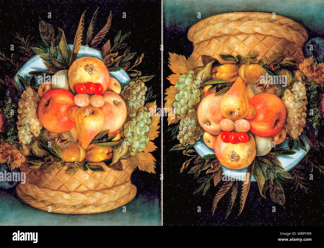 Giuseppe Arcimboldo (Milão, 1527 — 11 de julho de 1593) foi um pintor italianoSuas obras principais incluem a série "As quatro estações", onde usou, pela primeira vez, imagens da natureza, tais como frutas, verduras e flores, para compor fisionomias humanas Arcimboldo trabalhou inicialmente com o seu pai Biaggio Arcimboldo, artista que trabalhava em afrescos. Giuseppe Arcimboldo, también escrito Arcimboldi (Milán, 1527ibidem, 11 de julio de 1593), fue un pintor italiano, conocido sobre todo por sus representaciones manieristas del rostro humano a partir de flores, frutas, plantas, animales u objetos, pintaba representaciones de estos objetos en el lienzo, colocados de tal manera que todo el conjunto tenía una semejanza reconocible con el sujeto.