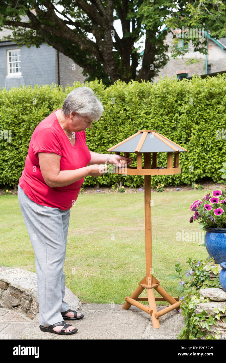 Mujer Colocando Los Alimentos De Aves En Un Comedero Para Pajaros De Madera Nueva En Un Pais Jardin South Devon Uk Fotografia De Stock Alamy