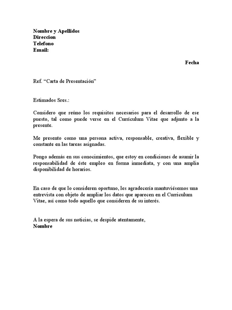La carta de presentación es el documento que complementará la presentación de tu curriculum vitae Ante un mercado laboral con tantas personas buscando un empleo, la diferenciación es un elemento clave a tener en cuenta Sin embargo, es esa gran competencia la que nos obliga a sintetizar la información que queremos ofrecer. Modelos de cartas de presentación de un curriculum Algunos anuncios de trabajo le piden que envíe su CV (curriculum vitae) junto a una carta de presentación Sin embargo, no envíe un curriculum a una compañía sin carta de presentación, pues resulta demasiado confuso;. Modelos de carta de presentación que respondan a un anuncio o de autocandidatura Modelos de carta de presentación creativos, genéricos o breves Modelos de carta de presentación dependiendo del país en el que quieras trabajar Modelos de carta de presentación para candidatos sin experiencia y estudiantes Escoge tu modelo de carta.