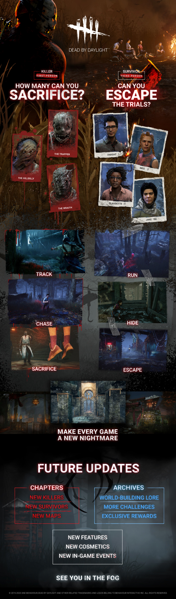 “Dead by Daylight” podrá ser tuyo sin costo alguno siguiendo estos pasos Los DLC del juego gratis también están con descuento, que varía oscila entre el % y 40%. Disfruta de 30 % de descuento en el precio de Auric Cells en los personajes Adam Francis y The Clown entre el 21 y el 28 de octubre para celebrar el lanzamiento Actualización gráfica de The Realm Beyond Dead by Daylight actualmente está recibiendo una remasterización completa en sus gráficos En el transcurso del año siguiente, con cada. Dead by Daylight is an asymmetrical, multiplayer (4 vs 1) horror game where one player takes on the role of a savage killer, and the other four players become Survivors, frantically scurrying to avoid being caught, tortured, and killed Survivors play in thirdperson and have the advatage of better situational awareness.