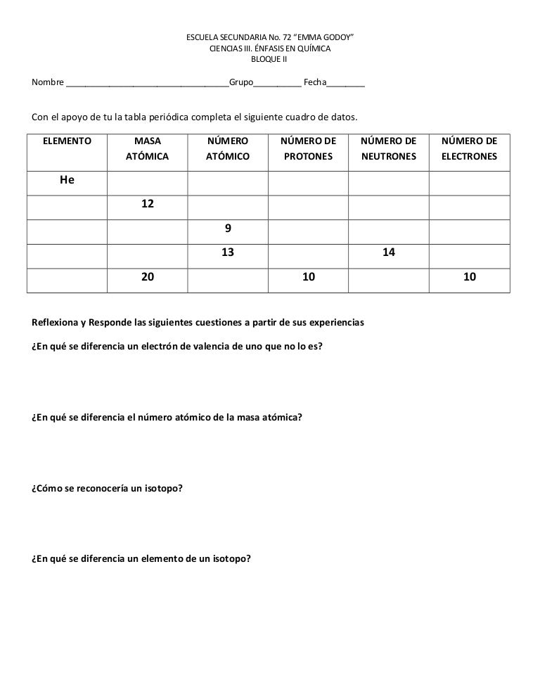 El peso atómico es básicamente una medida del número total de partículas en el núcleo del átomo incluyendo ambos protones y neutrones Entonces, el primer paso es localizar la masa atómica en la tabla periódica y redondear el valor al número entero más cercano. Cálculo de neutrones protones y electrones Para el cálculo de protones (p), electrones (e) y neutrones (n±) debemos de saber el número atómico del elemento químico así como su número de masa La masa atómica de la tabla periódica se debe redondear al número más cercano para obtener un número entero Observemos algunos ejemplos. Completa la tabla siguiente Elemento Símbolo Z A protones electrones neutrones Manganeso 25 30 C 14 6 3 Define a) número atómico e) capa de valencia b) numero másico f) periodo c) isótopo g) grupo d) ion h) octeto electrónico 4 Explica cómo es el átomo según el modelo de Rutherford.