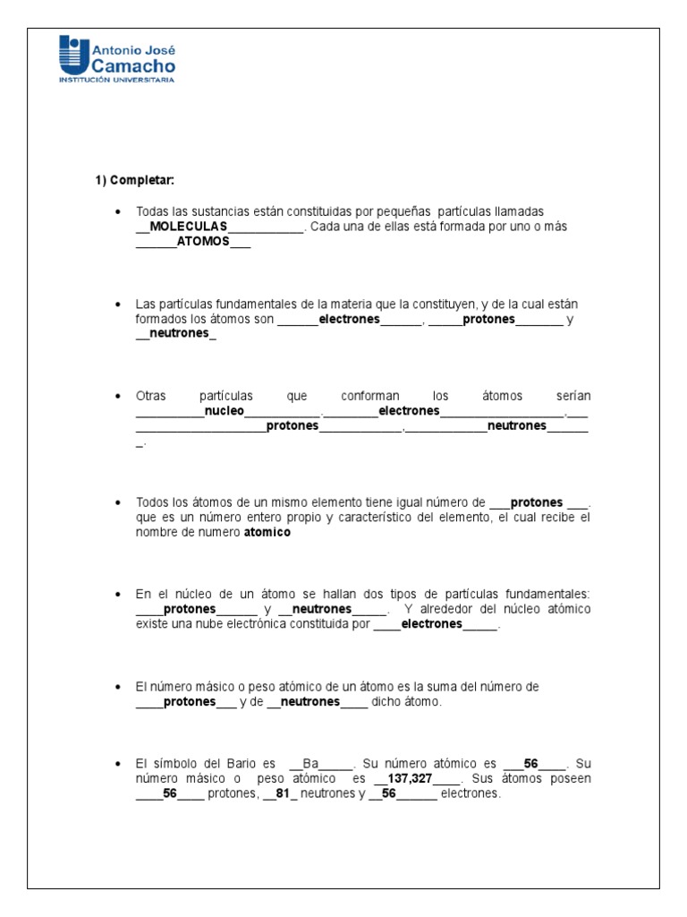 Los átomos de yodo se agregan como aniones, y cada uno tiene una carga 1 y una masa de 127 Determine el número de protones, neutrones y electrones en uno de estos aniones de yodo Solución El número atómico del yodo (53) nos dice que un átomo neutro de yodo contiene 53 protones en su núcleo y 53 electrones afuera de su núcleo. Así dos átomos con 6 protones en el núcleo, pero uno con 6 neutrones y otro con 8 serán ambos átomos del mismo elemento (carbono en este caso) y por lo tanto serán isotopos Para distinguirlos se suele agregar el número másico al final del nombre de manera que el primero sería Carbono12 y el segundo sería Carbono14. Ficha online de Protones, electrones y neutrones para 11mo Puedes hacer los ejercicios online o descargar la ficha como pdf.