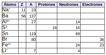 Por cierto, el de 9 electrones es el Flúor (F) y el de 10 el Neón (Ne) Lo puedes comprobar en la tabla periódica de los elementos Ejemplos de la Configuración Electrónica Veamos algunos ejemplos más Configuración electrónica del Nitrógeno Lo primero miramos en la tabla periódica y tiene un número atómico = 7. A finales del siglo y durante el siglo se produjo una serie de descubrimientos que indicaban que las partículas últimas que constituyen la materia no son esferas compactas e indivisibles —como había imaginado Dalton—, sino que los átomos están formados a su vez por otras partículas, fundamentalmente electrones, protones y neutrones, denominadas partículas subatómicas. Indique el número de protones y neutrones que tiene cada núclido a) fósforo – A=31, Z=15 b) cromo –A=52, Z=24 c) cobaltoA=60, Z=27 3 Complete la siguiente tabla suponiendo que cada columna representa un Átomo neutro SIMBOLO K Mn Cd Ba Pb PROTONES 25 NEUTRONES 30 64 ELECTRONES 19 48 56 NUMERO DE MASA 39 137 7 4.