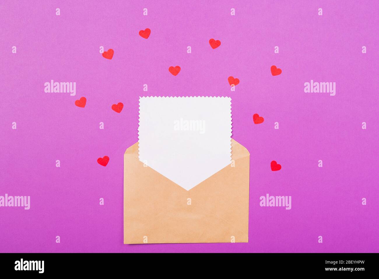 Dia De San Valentin Carta De Amor Mascup Carta Del Dia De La Madre Simulada Sobre De Artesania Con Tarjeta Blanca Y Corazones En Color Purpura De Fondo Vacaciones Fotografia De Stock