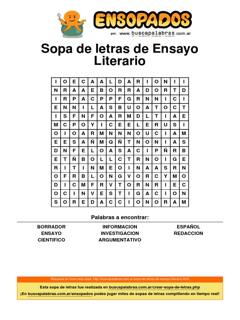 Sopa De Letras De Ensayo Literario Palabras A Encontrar