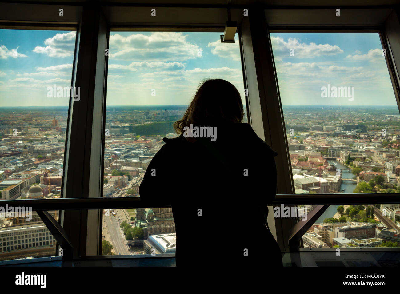 Silhouette Of Back View Of Woman Looking Out Of A Window At The Berlin City Skyline View From Inside Of The Tv Tower Building By Maor Winetrob Photo Stock Snapwire