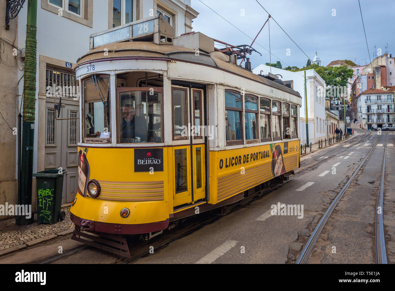El Famoso Tranvia 28 Lisboa En Escolas Gerais Street En El Distrito De Alfama De Lisboa Portugal Fotografia De Stock Alamy