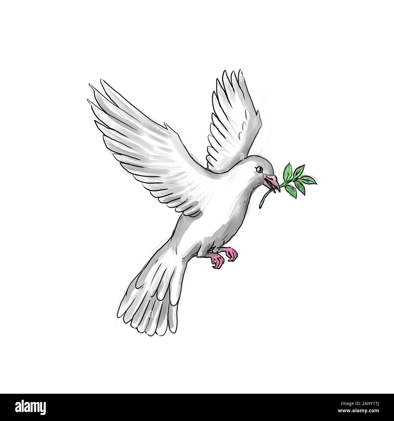Ilustracion Estilo Tatuaje De Una Paloma O La Paloma Volando Con La Rama De Olivo Fotografia De Stock Alamy
