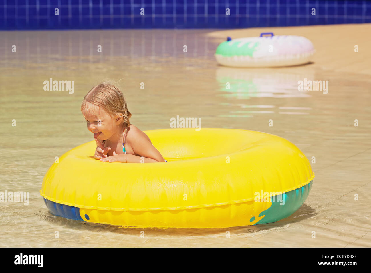 Funny Portrait Of Cheerful Baby Girl Swimming With Fun On Yellow Tube Stock Photo Alamy