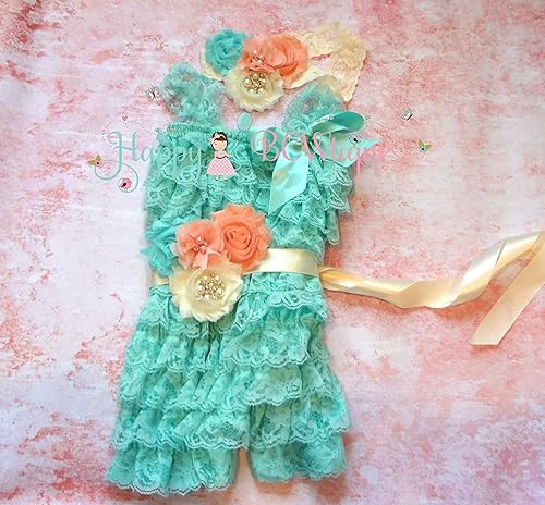Amazon Com 3pcs Ivory Blush Aqua Lace Petti Romper Set Baby Girl Aqua Lace Romper Handmade