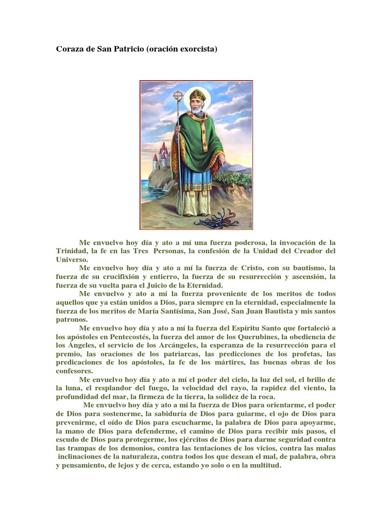 S an Patricio fue un sacerdote católico que dedicó gran parte de su vida a la evangelización Oración a la Coraza de San Patricio contra las asechanzas del mal A esta oración se le conoce como Pectoral o Coraza de San Patricio Se utiliza para alejar las influencias malignas y demoníacas. 17/03/ 1217 pmEn el día de San Patricio, el Arzobispo de Dublín y Primado de Irlanda, Mons Eamon Martin, alentó a rezar la oración conocida como “La coraza de San Patricio” para. La oración de la coraza de San Patricio es la forma de comunicarnos con Dios, invocando su protección para que nos aleje de todo mal Gracias a la oración Él nos cubre con su armadura contra toda influencia demoníaca Aprendamos en este post esta oración a la cual acudir en momentos de asechanzas del mal.
