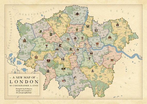 Decorative Map Of Greater London And Its Boroughs Etsy