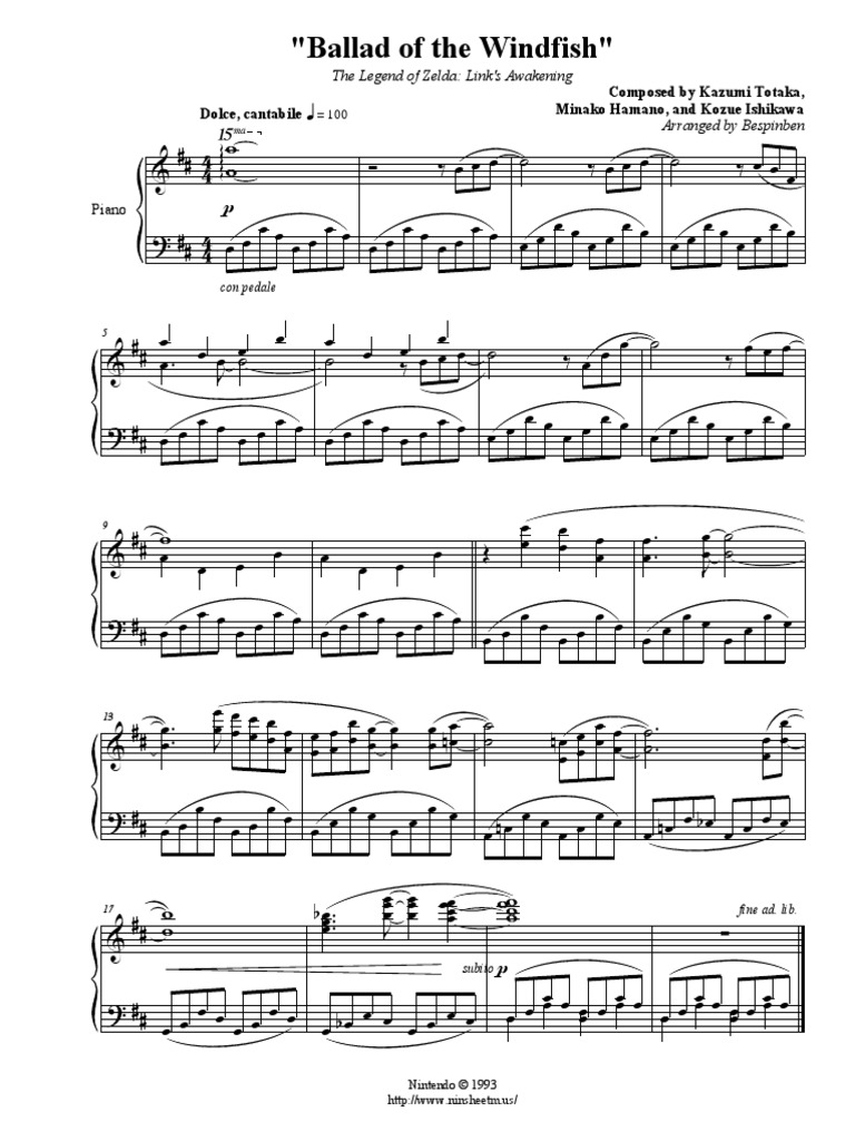 Download and print in PDF or MIDI free sheet music for Legend Of Zelda Links Awakening Ballad Of The Wind Fish by Misc Computer Games arranged by PerfectlyGenericAmateurPianist for Piano (Solo). The Ballad of the Wind Fish digital sheet music Contains printable sheet music plus an interactive, downloadable digital sheet music file Does not contain lyrics Not available for purchase in Japan Title The Ballad of the Wind Fish By NintenMusic. The Ballad of the Wind Fish digital sheet music Contains printable sheet music plus an interactive, downloadable digital sheet music file Does not contain lyrics Not available for purchase in Japan Title The Ballad of the Wind Fish By NintenMusic.