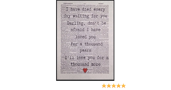 A thousand years Letra (Verse 1), Heart beats fast, Colors and promises, How do be brave, How can I love when I'm afraid, To fall, But watching. Mattata Decor Gift A Thousand Years Song Lyrics Sheet Music Portrait Poster Print (12" x 18") $2499 A Thousand Years by Christina Perri inspired wedding song lyric wall art print, unique first paper anniversary gift idea 44 out of 5 stars 29 $1995 Only 3 left in stock order soon. For a thousand years I'll love you for a thousand more And all along I believed I would find you Time has brought your heart to me I have loved you for a thousand years I'll love you for a thousand more One step closer One step closer Chorus I have died everyday waiting for you Darling don't be afraid I have loved you For a thousand years I.