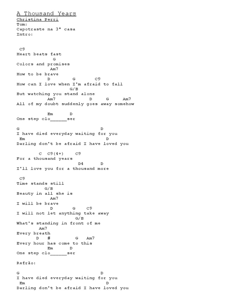 Aprende a tocar el cifrado de A Thousand Years (Christina Perri) en Cifra Club Principal 29kb Alex Siqueira Completa 2609kb Davi Lopes Versaocifraecomletrapara 86kb Marcelo Minal Orquestra 1015kb 2244 Filipe Ferreira Original 169kb 2114 Sérgio Moraes Versão 6 387kb 9328 Partiturasnahora Partituras. Glee A Thousand Years (Letras y canción para escuchar) The day we met / Frozen I held my breath / Right from the start / I knew that I'd found a home for my heart beats fast / Colors and promises / How to be brave. A Thousand Years Christina Perri Intro G Em Cadd9 G D Verse 1 Cadd9 Heartbeats fast Em Colors and promises How to be brave D Cadd9 How can I love when I'm afraid to fall Em But watching you stand alone D Am All of my doubt suddenly goes away somehow Em D One step closer Chorus G I have died everyday waiting for you Em D Darling don't be.