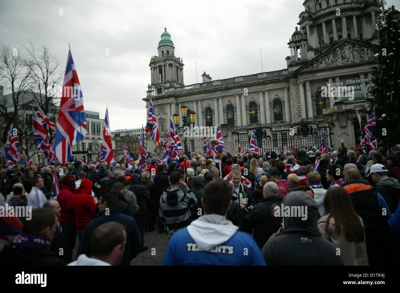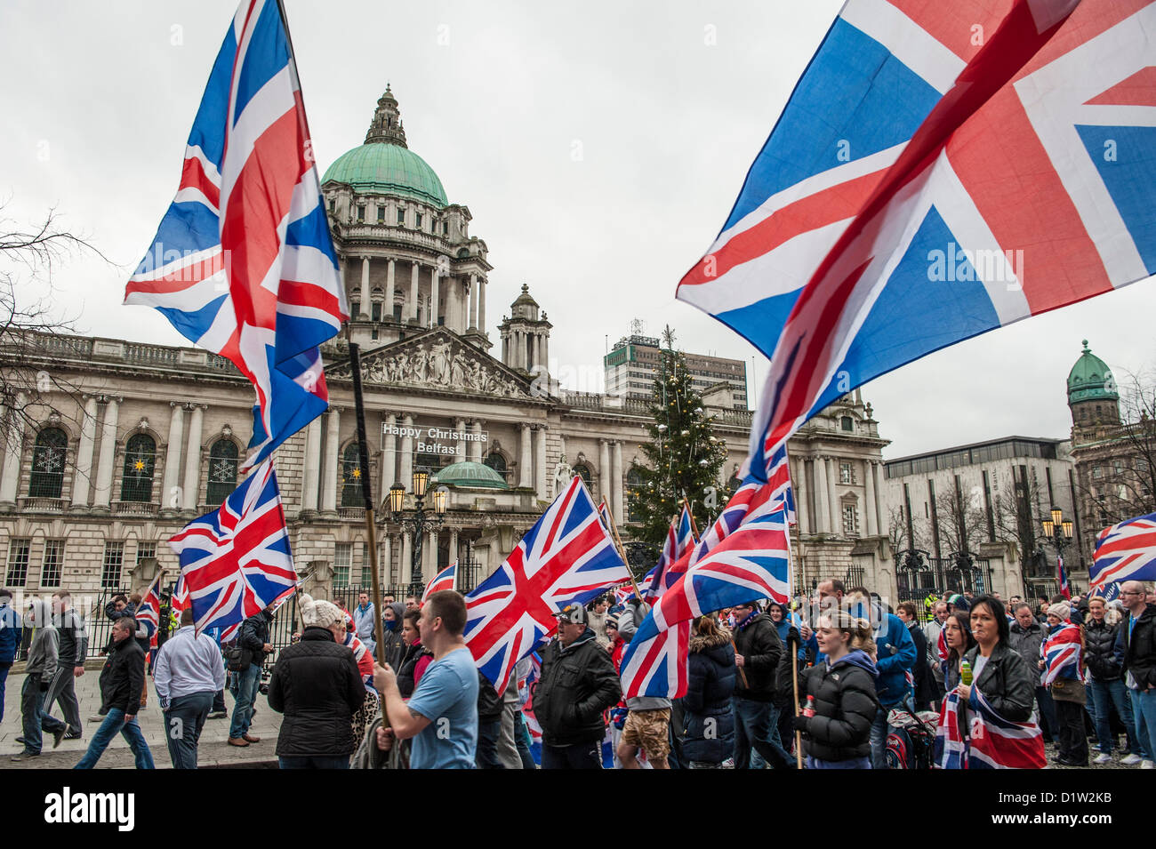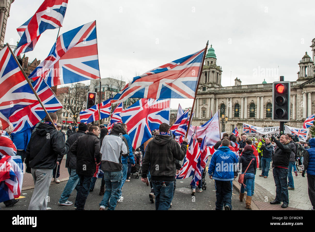 Turning to the disturbances in Belfast and other parts of Northern Ireland since I last reported to the House on 11th Dec, protests over the flying of the Union Flag at Belfast City Hall have. Loyalist march waving British Union Flags in Belfast, Northern Ireland on December 8, 12 in protest over Belfast city council's decision to restrict the number of days the Union Flag will be flown over the city hall (AFP Photo / Peter Muhly) © AFP. Fifteen people including five children were arrested in Belfast last night during further protests against restrictions on flying the unionist flag on City Hall, UTV reports.