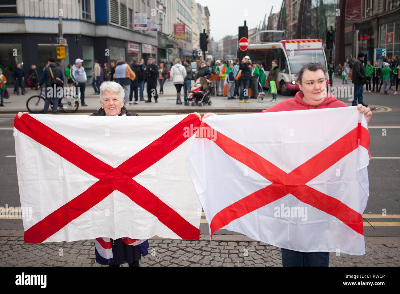 Belfast Uk 17th March 15 Two Women Hold Up A St Patrick S Flag Stock Photo Alamy