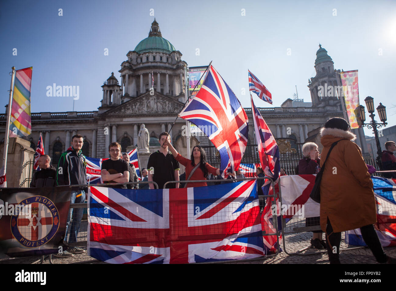 Around 2,000 people took part in a protest at Belfast City Hall today over the ongoing issue of the flying of the Union Flag The march, from Belfast City Hall to the Shankill road, passed off. Loyalist protest march at Belfast City Hall following the Council's decision to stop flying the Union flag all year round and to limit it to 17 designated days. Belfast City Council voted in December 12 to limit the flying of the union flag to designated days, including the Queen's birthday It sparked loyalist protests and violence outside the city hall.