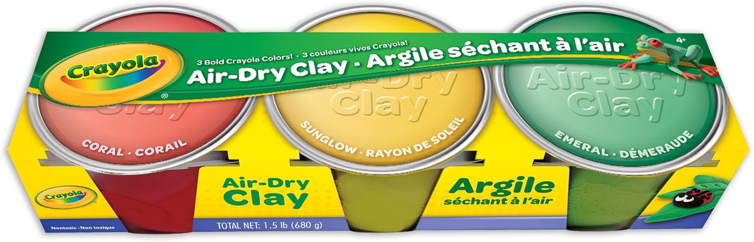 Easy to use with traditional modeling techniques, it's also a snap to clean up AirDry Clay is smoother, finer and less sticky than traditional clay. CRAYOLA AIR DRY CLAY Features 5 Air Dry Clay Packs, each individually packaged for freshness CRAYOLA COLORS This Modeling Clay Set features 1 Pack of Terra Cotta/Brown, Black, and Yellow, plus 2 Packs of White Clay AIR DRYING CLAY Air dries to a smooth, resilient finish with no oven or kiln is required, making it an essential craft supply for kids.