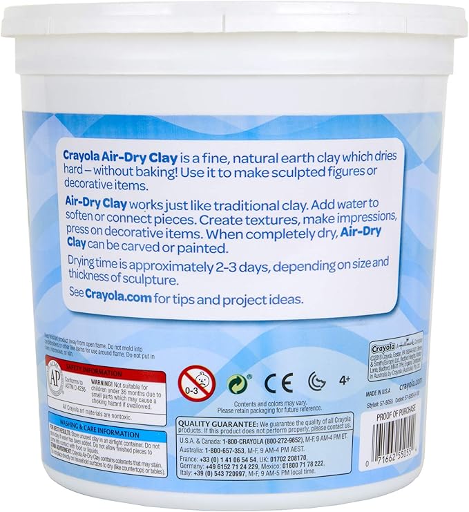 3 Crayola AirDry Clay For pristine white airdry clay that is easy to use, reach for Crayola This hefty, 25pound carton of clay is ideal for educators most clay projects require about half a. Air Dry Clay quantity 1 brand name Crayola Ecoconscious Less Harsh Chemicals Eco Label Standard Certified AP Nontoxic manufacturer CRAYOLA LLC Product Type Craft Material Product Model. CONVENIENT Reusable plastic bucket makes storage a snap Clay is also easy to clean up!.