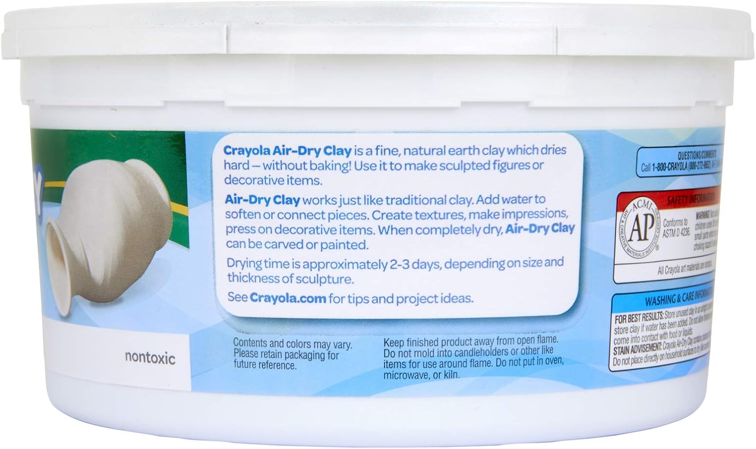(4 EA) CRAYOLA AIR DRY CLAY 25LB Natural earthen clay dries hard No kiln or oven necessary Easy to use with traditional modeling techniques Easy cleanup 25 pounds each, bundle of 4, 10 pounds total Product Details. COMPATABILITY Feel free to paint with acrylic, tempera and watercolor!. At Crayola, we have unique DIY craft ideas for your next Air Dry Clay project!.