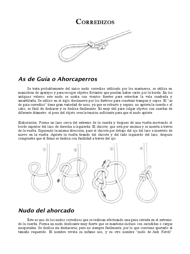 Independientemente de lo útil o no que pueda resultar un nudo, éste debe ser considerado bueno al mismo tiempo que eficaz desde el punto de vista de la larga tradición marineraEste libro El manual completo de los nudos se presenta dividido en dos partes La primera parte recoge los nudos y ayustes básicos, junto con alguno de tipo decorativo que se han introducido como complemento. Existen diferentes tipos de nudos marineros, cada uno de ellos con sus propias característicasTal y como hemos señalado, sirven para diferentes fines, de modo que el modo de hacerlos también es distinto Resulta interesante conocerlos ya que, además de su uso en el mar, también tienen un amplio abanico de utilidades en la vida cotidiana agarrar un cubo a una cuerda, sujetar un. Nudos marineros Si eres navegante y te gusta el mar, aquí podrás descubrir todos los nudos marineros y aprender como realizar un nudo para pescar con anzuelo Dispones de 35 nudos marineros Nudos de escalada Si te gusta el deporte y practicas escalada o alpinismo, aquí aprenderás todos los nudos que debes conocer.