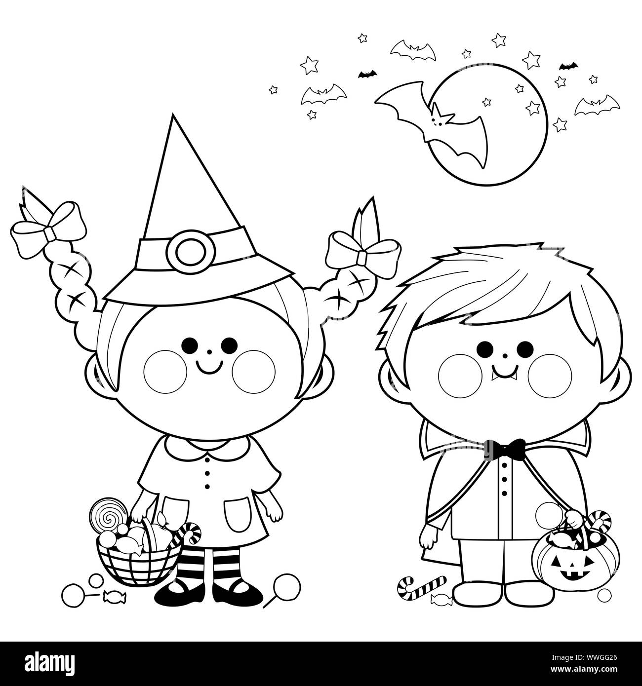 Ninos Vestidos Con Disfraces De Halloween Mantenga Cubos Con Caramelos Pagina De Coloracion Blanco Y Negro Fotografia De Stock Alamy