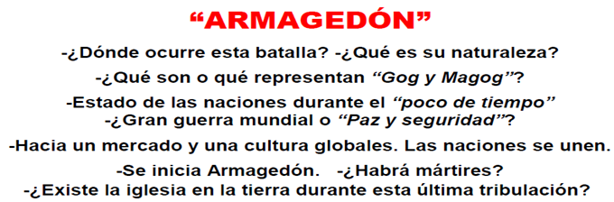 Se reunirán en el Norte de Israel para librar la batalla culminante que la Biblia llama “la batalla de aquel gran día del Dios Todopoderoso” (Apocalipsis 1614) La mayoría de los comentaristas se refieren a este increíble suceso como “Armagedón”, “la batalla final entre el bien y el mal” ¿Quién va a ganar?. Cuando la biblia habla de la batalla de Armagedón, no se refiere a la ciudad sino al valle que está en la misma región Este se encuentra ubicado al borde sur de la llanura de Isacar, 5560 millas al noreste de Jerusalén y millas al oriente del puerto de la ciudad de Haifa, dentro del moderno estado de Israel. La batalla de Armagedón tendrá lugar al final del período de plagas de la ira de Dios, justo antes de principiar el Milenio En cambio, la de Gog y Magog pondrá término al Milenio Si Gog y Magog participan en ambas batallas, es señal de que la segunda será un intento de revivir el imperio del Anticristo y las fuerzas sobre las que.