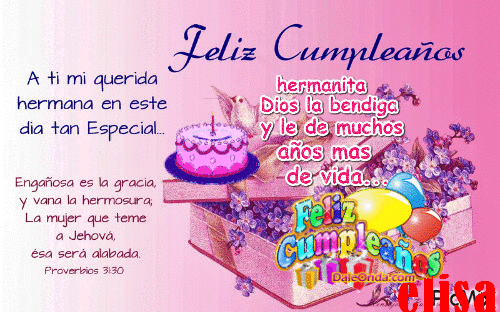 Bonitos mensajes cristianos de feliz cumpleaños para mi hermana, frases cristianas de felicitación para mi hermanita querida por Mery Bracho. Feliz Cumpleaños GIF gratis Happy birthday cards and GIFs in Spanish, Free Download Imágenes de cumpleaños GIF animadas gratis New!. Feliz cumpleaños a la persona más encantadora del planeta!.