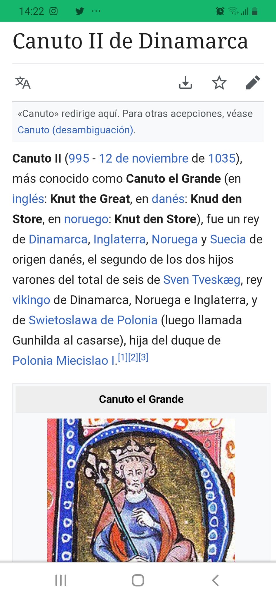 Canuto II (995 12 de noviembre de 1035), más conocido como Canuto el Grande (en inglés Cnut the Great, en danés Knud den Store, en noruego Knut den Store), fue un rey de Dinamarca, Inglaterra, Noruega y Suecia de origen danés, el segundo de los dos hijos varones del total de seis de Sven Tveskæg, rey vikingo de Dinamarca, Noruega e Inglaterra, y de Swietoslawa de Polonia (luego llamada Gunhilda al casarse), hija del duque de Polonia Miecislao I. Pareciendo a todos que en él había resucitado Canuto, el grande, no teniendo ya enemigos, que domar, se consagró a la novilísima empresa de labrar la felicidad de sus basallos Dio prudentísimas leyes, enderezadas a la reforma de las costumbres, eligió varón y de reconocido mérito para el gobierno, y la magistratura, reedificó muchas. ☠️ El rey Witiza muere en sospechosas circunstancias en el 710, año en que don Rodrigo, el último rey visigodo de verdad, accede al trono Tras diversas cons.