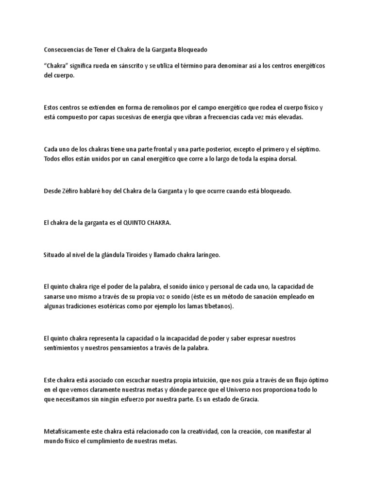 Entre otros Consecuencias de un chakra bloqueado La persona va a tener dificultades para hablar, expresarse o comunicarse. 12sep Explora el tablero de Yandy Achury "chakras" en Ver más ideas sobre chakras, chakra de la garganta, chakra. Cómo desbloquear el chakra de la Garganta El Chakra de la Garganta o quinto chakra es muy importante ya que es aquí donde se suelen almacenar todos los problemas de nuestra vida sentimental, que afecta a nuestras emociones y que suele acabar bloqueando el chakra por completo Hay muchas enfermedades que están relacionadas con el quinto chakra, ya que en este chakra suelen encerrarse los mayores problemas que podemos tener en la vida.