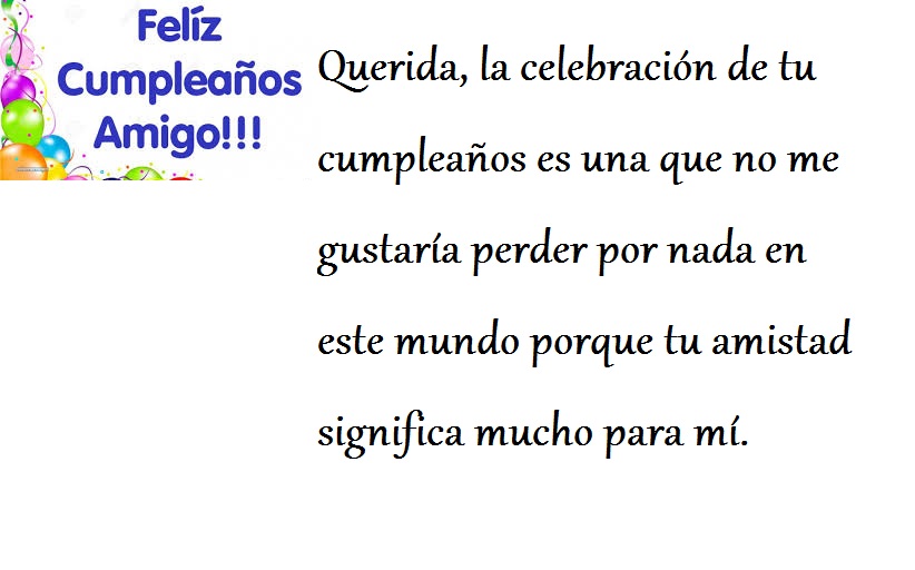 Palabras o dichos de los dos Para desear feliz cumpleaños a un amigo con una carta es importante hacer uso de las frases, palabras o cualquier otro dicho que usen solo los dos Y no hay nada mejor que algunas cartas de cumpleaños para una amiga, para que le dediques una felicitación muy especial en su día. “Mi mejor amigo está de cumpleaños, qué feliz me siento Su alegría es la mía, y por eso quiero que mi mejor amigo sea siempre muy bendecido por Dios, pues siempre es bueno conmigo y hace lo posible para apoyarme cuando lo necesito Que Dios ilumine su vida siempre y que lo pase muy bonito hoy Donde quiera que esté mi mejor amigo. 🎉 Imágenes de feliz cumpleaños amigo con mensajes Regalar imágenes de feliz cumpleaños amigo con mensajes maravillosos es una linda manera de desearle cosas bellas en su día a ese amigo que es especial Un cumpleaños es un momento para festejar y celebrar con regalos, una fiesta, una reunión divertida y con algo especial que haga sentir al cumpleañero muy feliz.