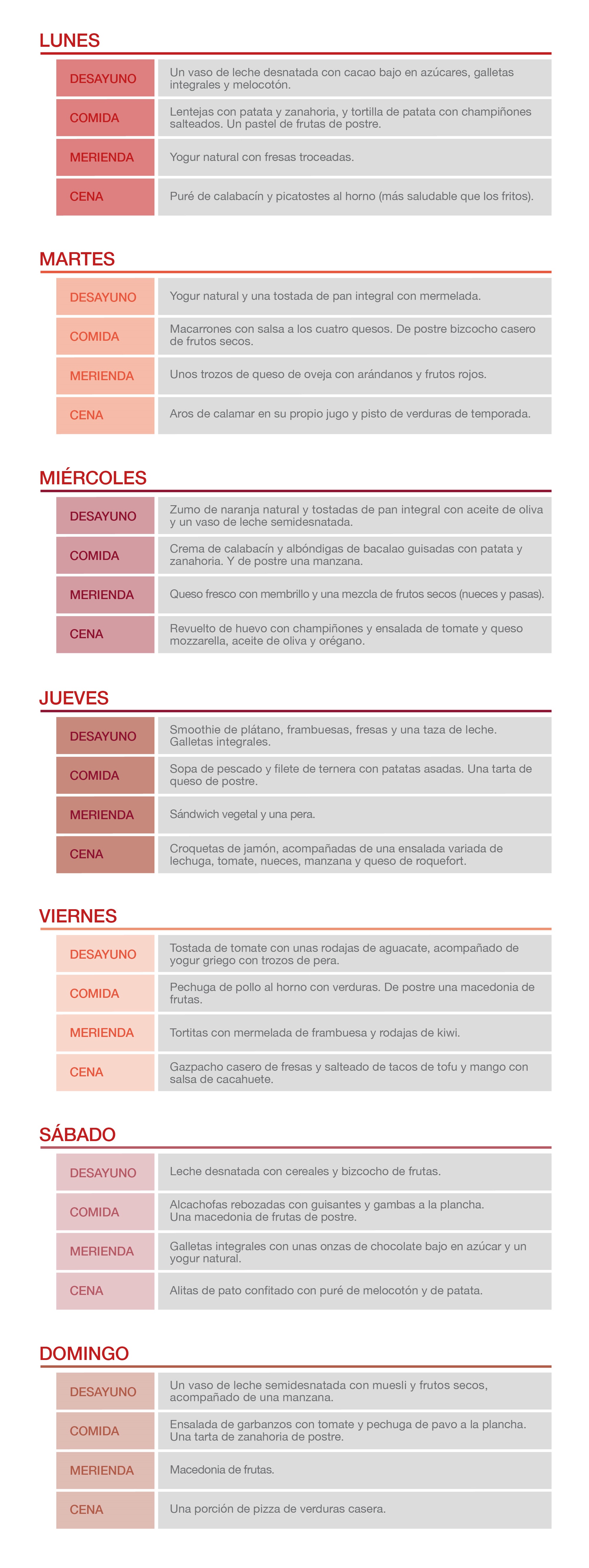 Gracias a estos nutricionistas hemos logrado un amplísimo libro con consejos sobre alimentación saludable para niños y un calendario con menús semanales para niños deportistas en los que se incluyen meriendas sanas para deportistas, recetas para hacer comidas equilibradas, dietas para niños de 6 a 12 años y más edades o desayunos sanos. Es muy recomendable hacerse una lista de la compra y un menú o calendario de comidas para facilitarnos el día a día y seguir más fácilmente una dieta saludable y equilibrada Elegir lo que se va a comer sin hambre conllevará a una elección de alimentos más saludables. ¿Quieres comer de manera saludable y fácil?.