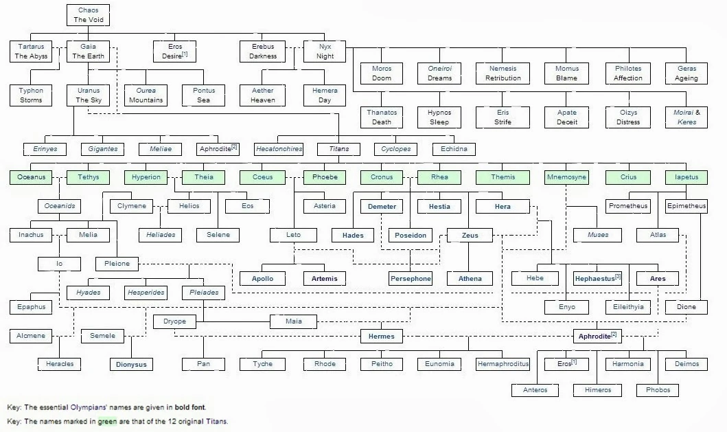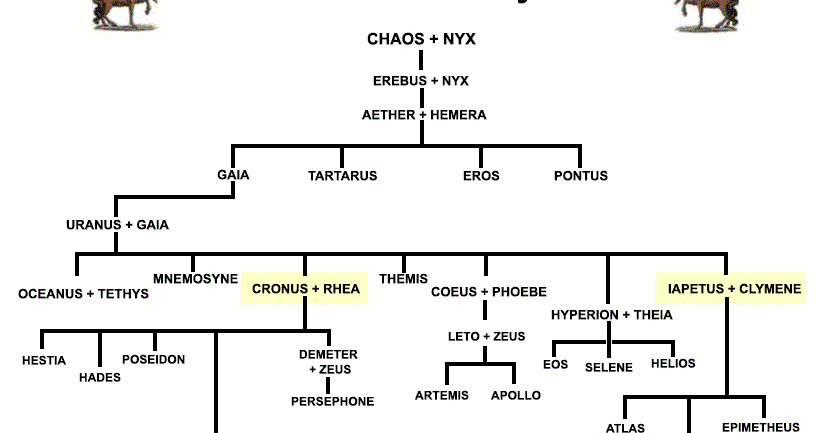 Family Trees Greek Legends and Myths THE GODDESS CHAOS IN GREEK MYTHOLOGY Today, the concept of chaos is one related to disorder, and most people will actually be surprised that Chaos was also a deity of the Greek pantheon, one born at the very start of time the lineage of chaos Magnum Chaos from Basilica di Santa Maria Maggiore in Bergamo. The Greek Family Tree shows Chaos as the originator of the Universe The word 'Chaos' came to mean the name of the first, primordial god and also as a term to describe the place of origin for the universe Mythical World of Chaos for kids We hope that you have enjoyed discovering interesting information and Chaos. Greek Gods Family Tree Chart Genealogy, Names and Roles of the Titans NAMES Genealogy, Definition, Role and Function Name Cronus Cronus was the youngest son of Gaia and Uranus and one of the Titans He married his sister Rhea Their children were Demeter, Hestia, Hera, Hades, Poseidon and Zeus.
