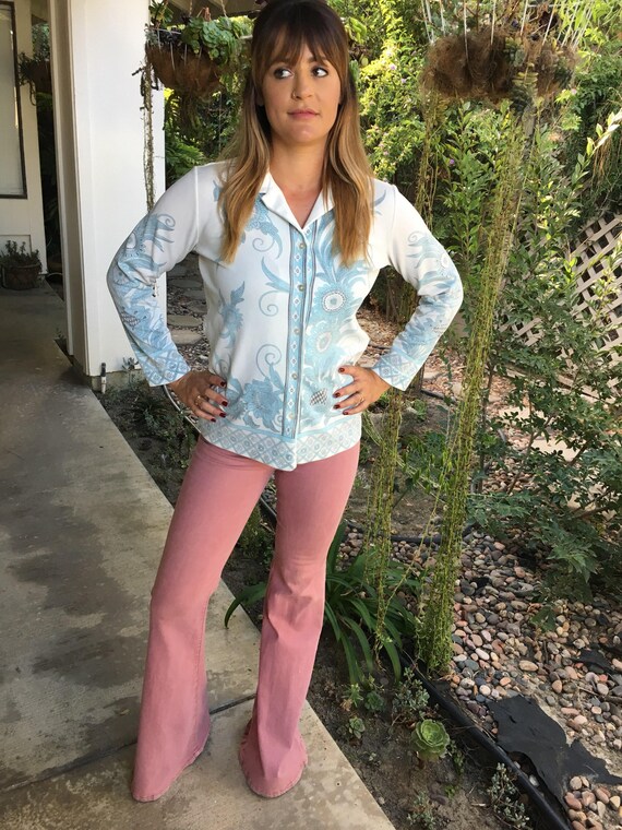 Vintage Button Up Blue Flower Shirt Womens 60s 70s Shirt Etsy